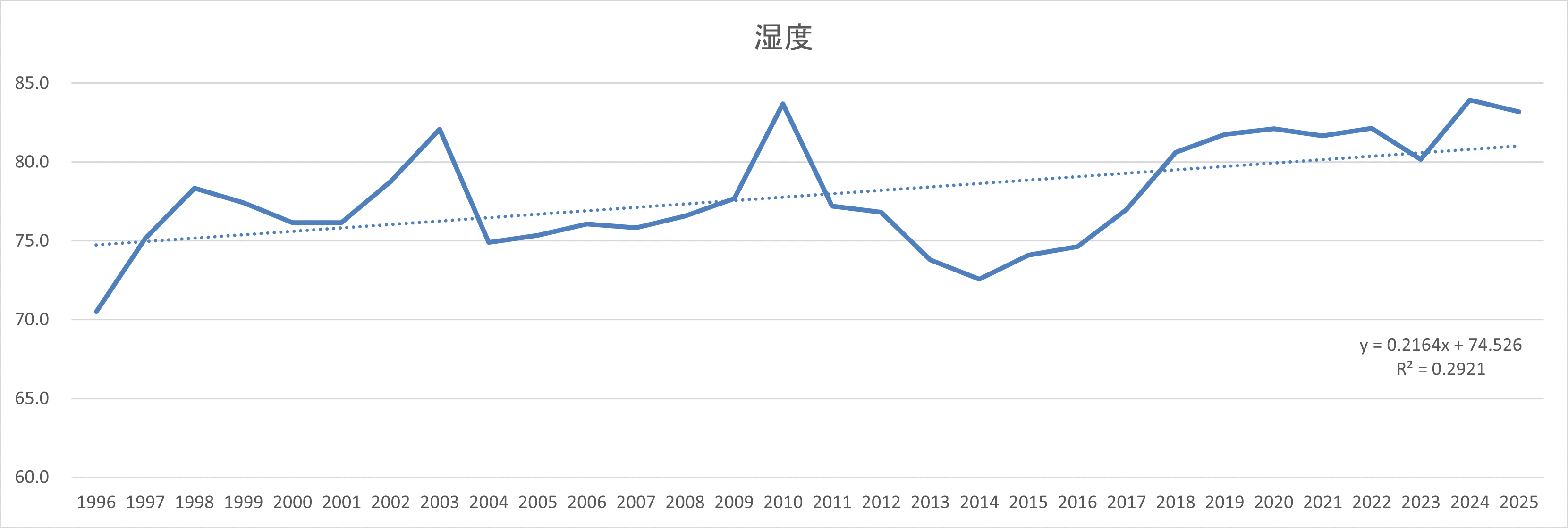 過去30年間(1996年~2025年)の霧ヶ峰高原の湿度の積算値です