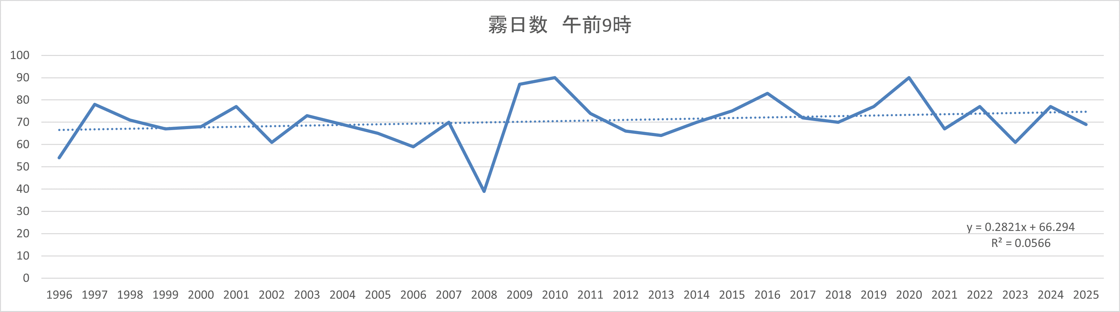 過去30年間(1996年~2025年)の霧ヶ峰高原の霧の観測日数の積算値です