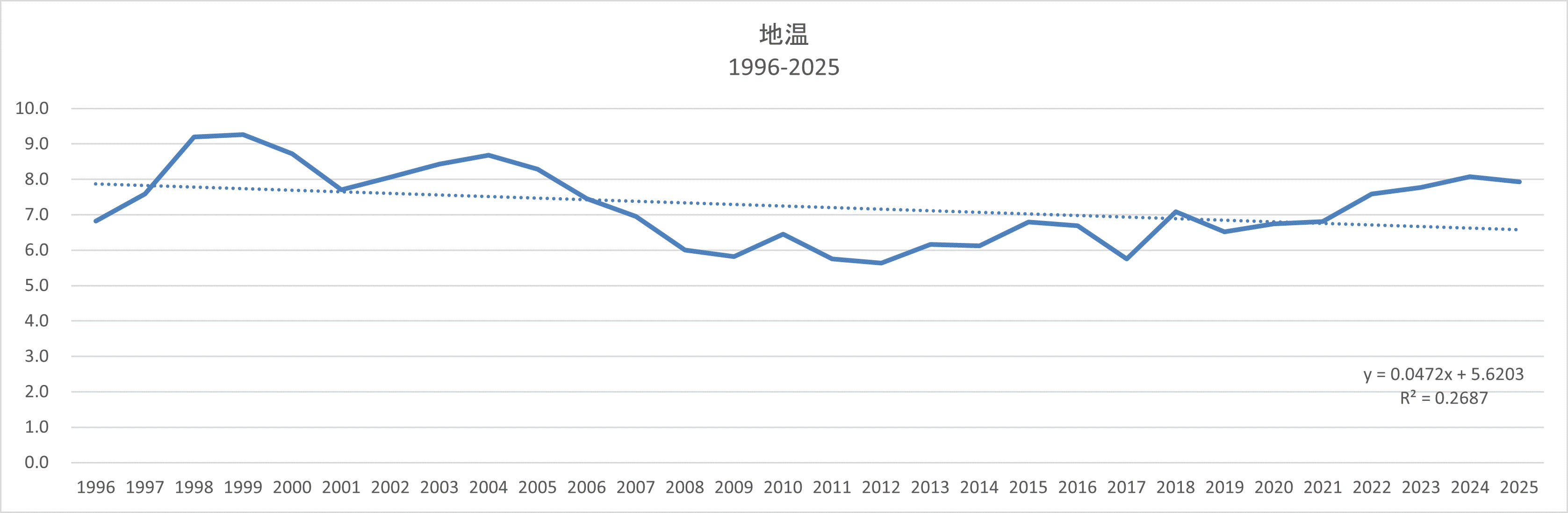 | 年間の平均地温は8.2℃です。地下10.0㎝で観測しています。 2月が一番低く1994年に-1.8℃の記録がありますが例年は-1.2℃です。 雪解けの3月、地温が上昇し地面が融けだすと取り付け道路は車も通れないほどの泥濘になります。しかし不思議なことにある日突然急に固まり始めまたいつもの春を迎えることができます。 |